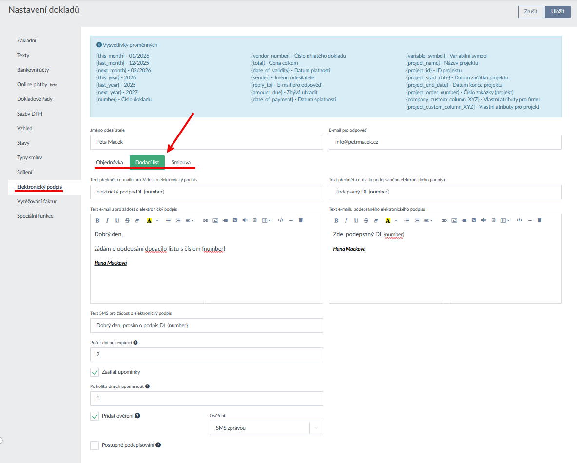 V Nastavení dokladů (záložka Elektronický podpis) si lze přednastavit šablony a formáty textů (včetně proměnných) pro jednotlivé typy dokladů. Zároveň si můžete nastavit i text SMS pro žádost o elektronický podpis.