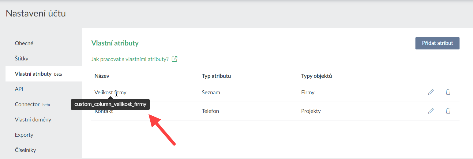 💡 Tip 1: do smluv lze také vkládat vlastní atributy (pro firmu či projekt) jako proměnné do textů smlouvy (do hlavičky, úvodník, těla, patičky) ve formátu {company_custom_column_XYZ} nebo {project_custom_column_XYZ}. Kód vlastního atributu (ve tvaru "custom_column_XYZ") získáte přes API nebo najetím kurzoru na název vlastního atributu v sekci "Vlastní atributy". U smlouvy pak určíte, zda se hodnota načítá s firmy na smlouvě nebo z projektu.