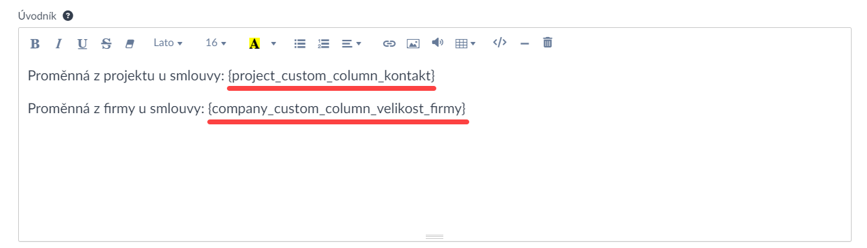 Tyto proměnné můžete použít v textových blocích smlouvy, např. v hlavičce, úvodníku, patičce nebo těle smlouvy: