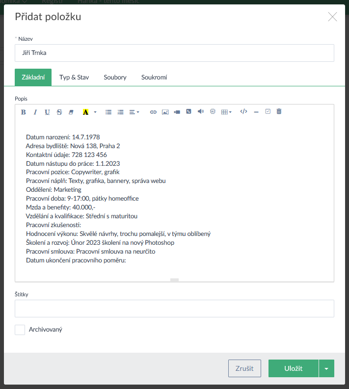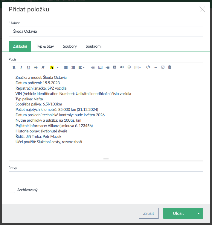 Registr je ideální pro evidenci majetku, aut, nemovitostí, zařízení nebo třeba zaměstnanců. Detaily k položkám registru si lze zapsat třeba v rámci popisu (viz obrázky níže) nebo pomocí vlastních atributů, které lze navázat na kategorii registru (viz níže).
