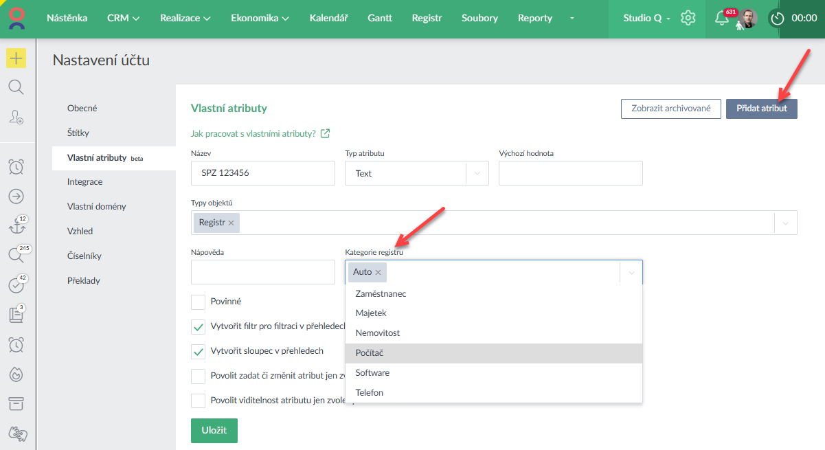 U Registru si lze nastavit také Vlastní atrituty, které lze podmínit kategorií (tj. jiné vlastní atributy pro Kategorii registru "auto" např. SPZ a jiné vlastní atributy u Kategorie registru "zaměstnaneců např. dovednosti).
