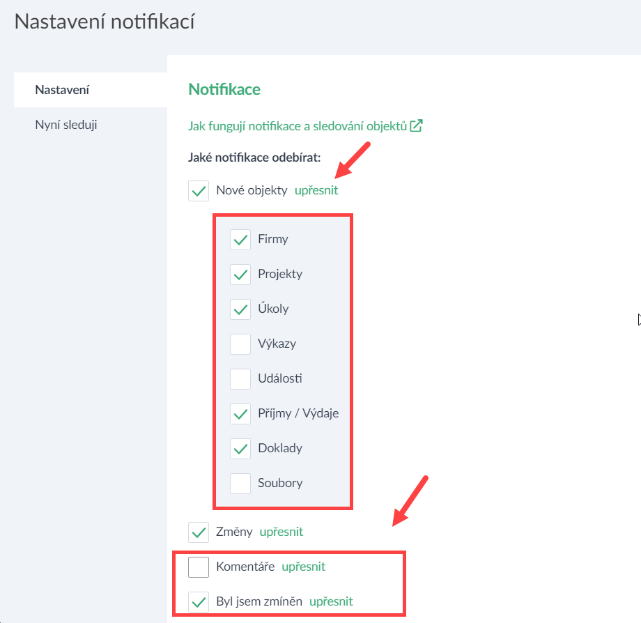 Volitelně si můžete vybrat, u kterých objektů nedostávat notifikace vůbec nebo např. nemusíte dostávat notifikace u komentářů, pokud v nich nejste zmíněni: