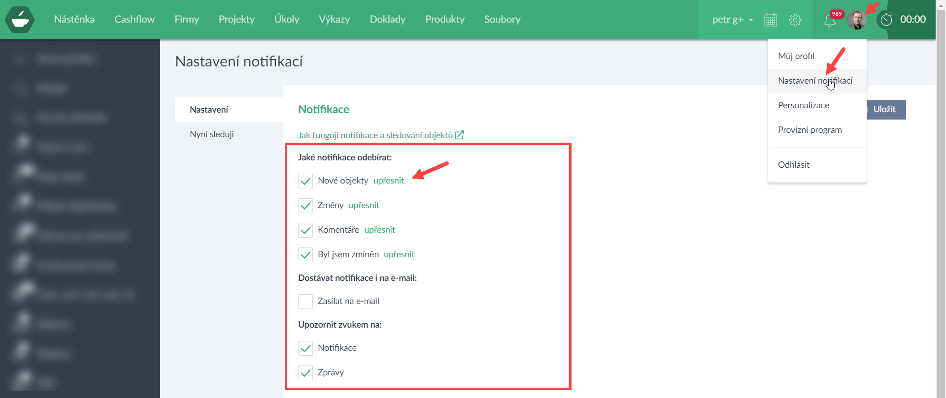 💡 Nad rámec běžných notifikací si lze nastavit (nadstandardní) automatické notifikace v rámci automatických procesů viz Jak vytvořit automatický proces / workflow. Tato automatizace se může hodit třeba u dokladů viz Proces na schvalování dokladů.