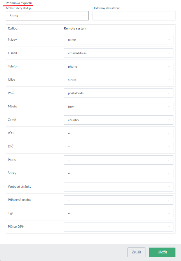 Následně je třeba nastavit si podmínku, při které se kontakty exportují do SmartEmailingu (např. pokud firma v Caflou má štítek XY nebo stav firmy je XZ).
