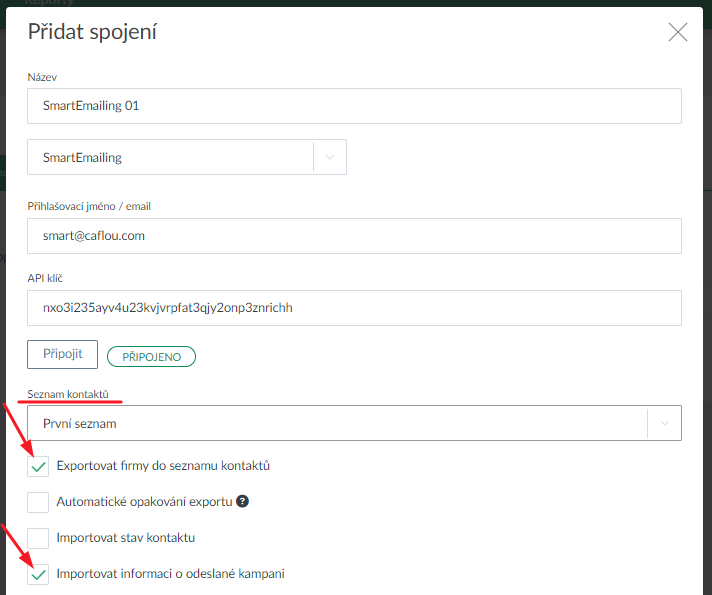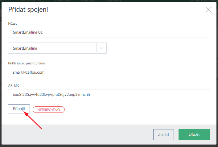 3) Zadáte Název spojení, zvolíte program, jako přihlašovací jméno použijete to, kterým se přihlašujete do SmartEmailingu, a zadáte dříve získaný API klíč a odkliknete Připojit.