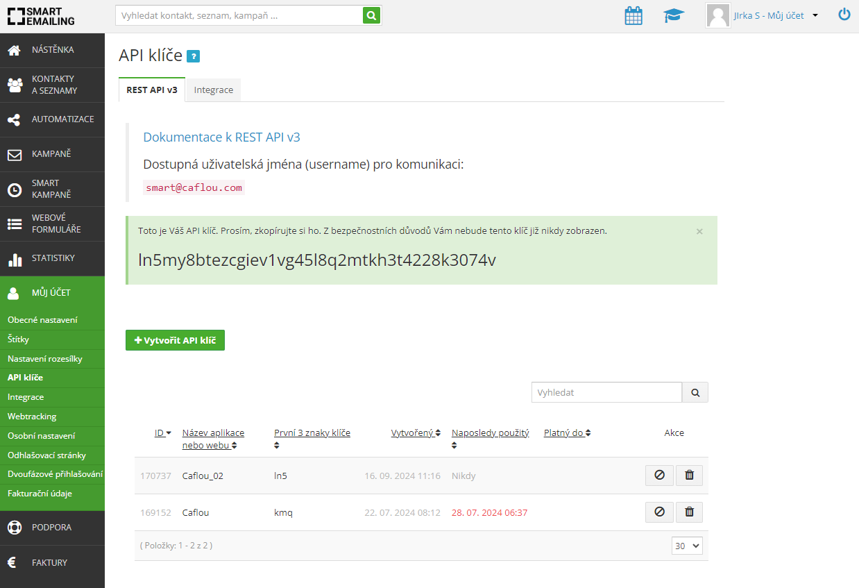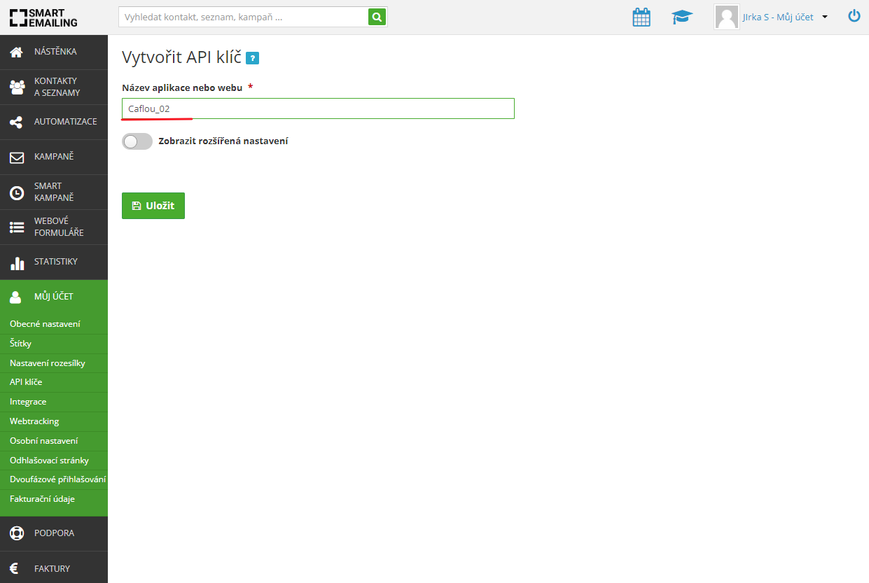 1) Aby mohlo proběhnout úspěšné propojení, je třeba nejprve získat ve SmartEmailingu API klíč (Můj účet - API klíče)