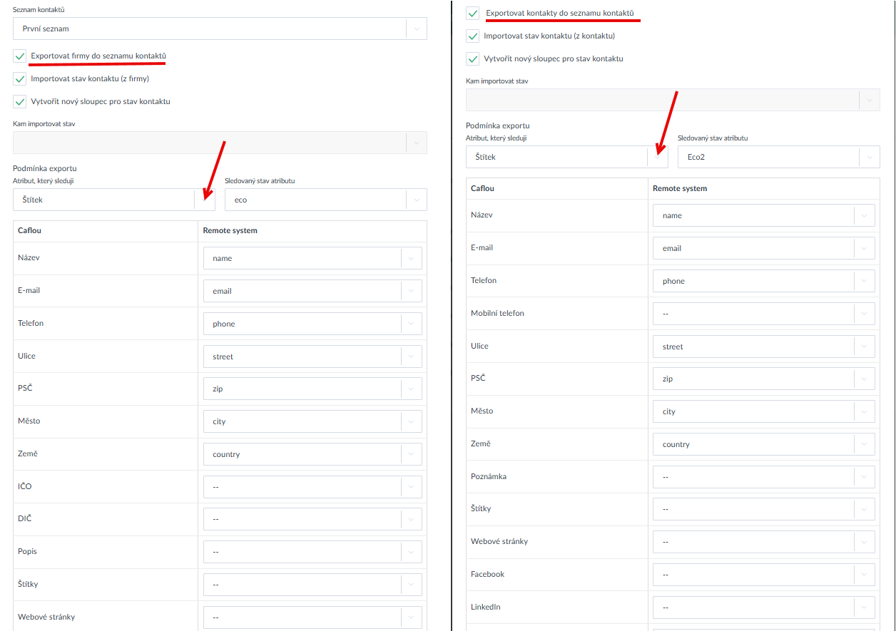 8) V posledním kroku je třeba nastavit správné spárování atributů (typicky www, telefon, adresa...), tedy do kterých políček ve SmartEmailingu se zapíšou které atributy z Caflou.