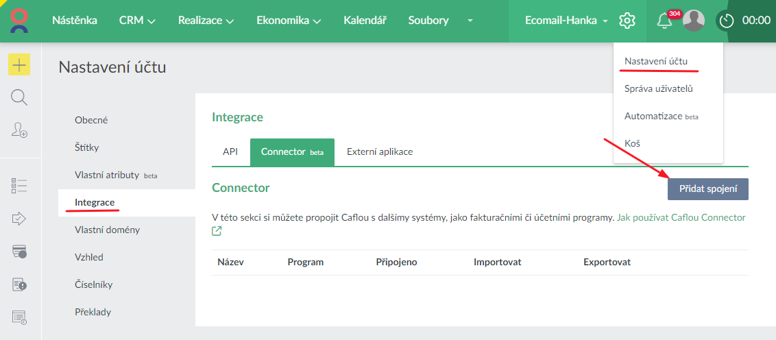 2) V sekci Nastavení účtu - Integrace - Connector zvolíte akci Přidat spojení: