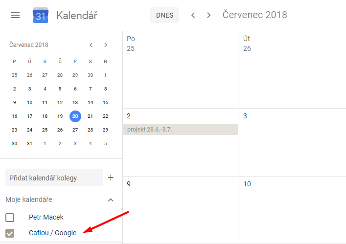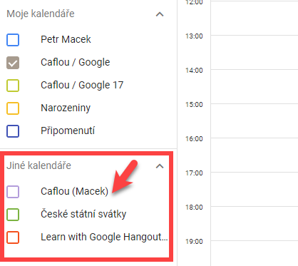Chvíli počkejte (10-20 vteřin), obnovte obrazovku s Google kalendářem a kalendář z Caflou bude nově integrován do Google kalendáře:
