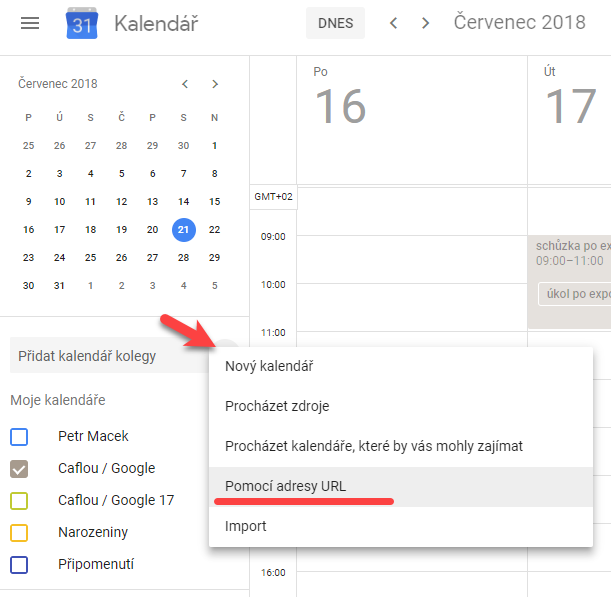V Google kalendáři zvolte možnost "Přidat kalendář kolegy" a "Pomocí adresy URL":