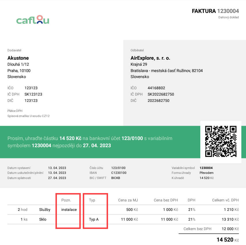 - pokud v Caflou používáte Produkty (=sklad/ceník), lze vlastní atribut produktu zobrazit na dokladu