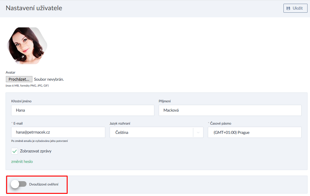 Zde je nutné "Dvoufázové ověření" zapnout a následně"Uložit":