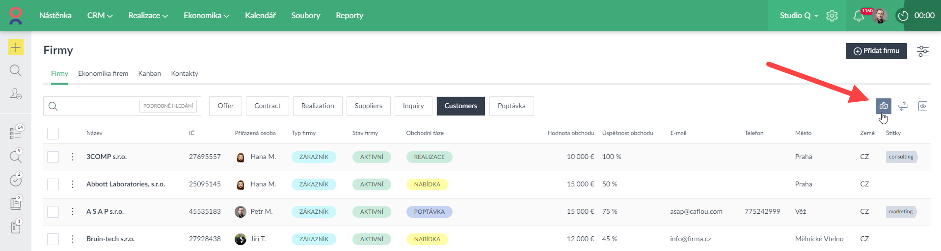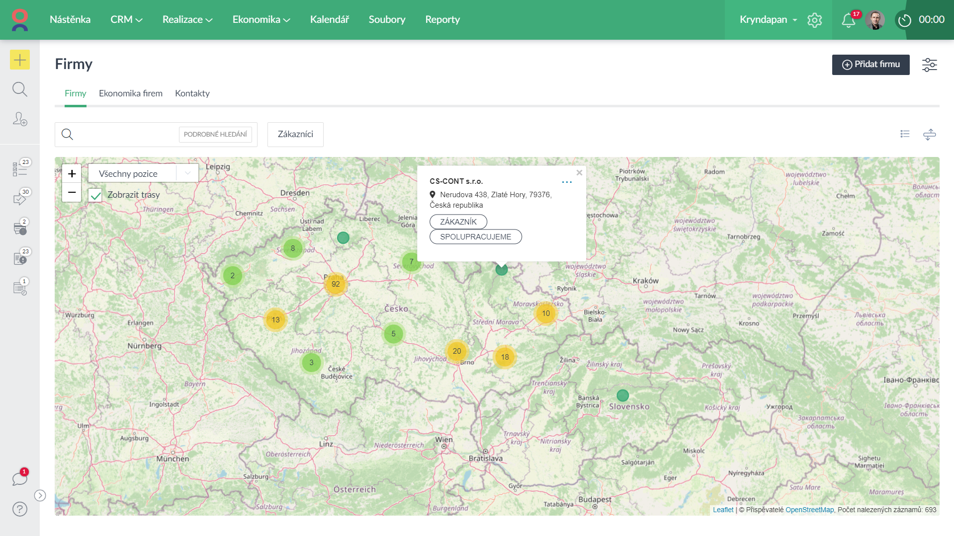 Veškeré firmy, které evidujete v Caflou (tedy zpravidla zákazníky či dodavatele) si můžete zobrazit na mapě a to i za použití filtrů.