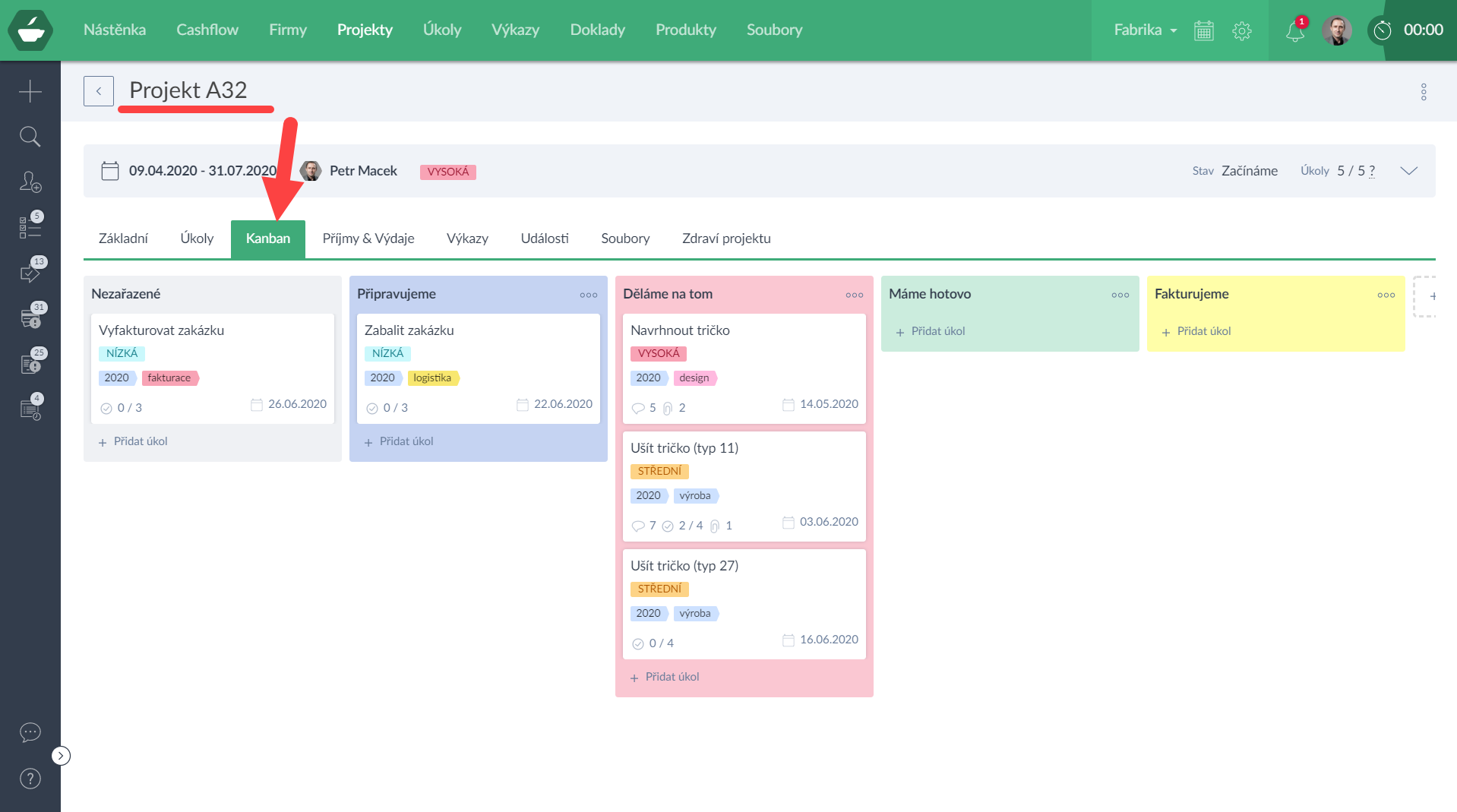 💡 Tip: Využít můžete i "globální" Kanban nástěnky pro všechny projekty a úkoly na úrovní účtu. Najdete je v sekci Realizace -> Projekty nebo Úkoly.