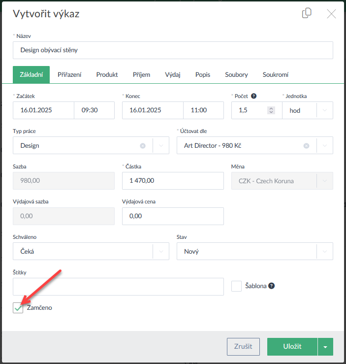Je-li výkaz uzamčen, pak je povoleno dodatečně u výkazu měnit pouze hodnoty atributů: Schváleno, Stav, Zamčeno.