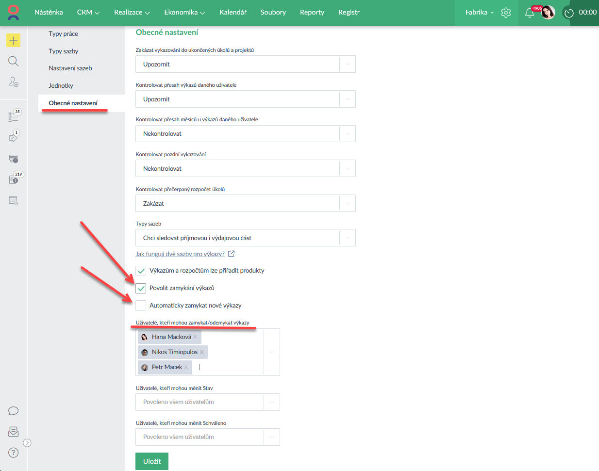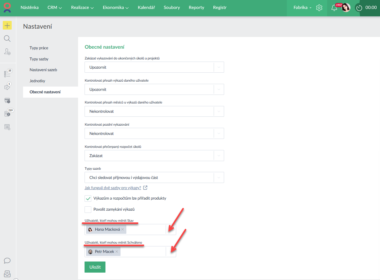 V sekci Nastavení sekce Výkazy - Obecné nastavení si můžete zvolit uživatele, kteří budou mít oprávnění měnit atribut Schváleno a Stav výkazu.