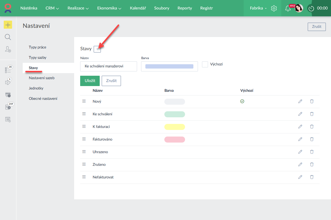 Doposud byla u výkazů pevně daná sada Stavů výkazů. Nově si můžete tuto sadu přizpůsobit podle vašich potřeb, tj. vytvořit si nové stavy a zvolit libovolnou barevnost.