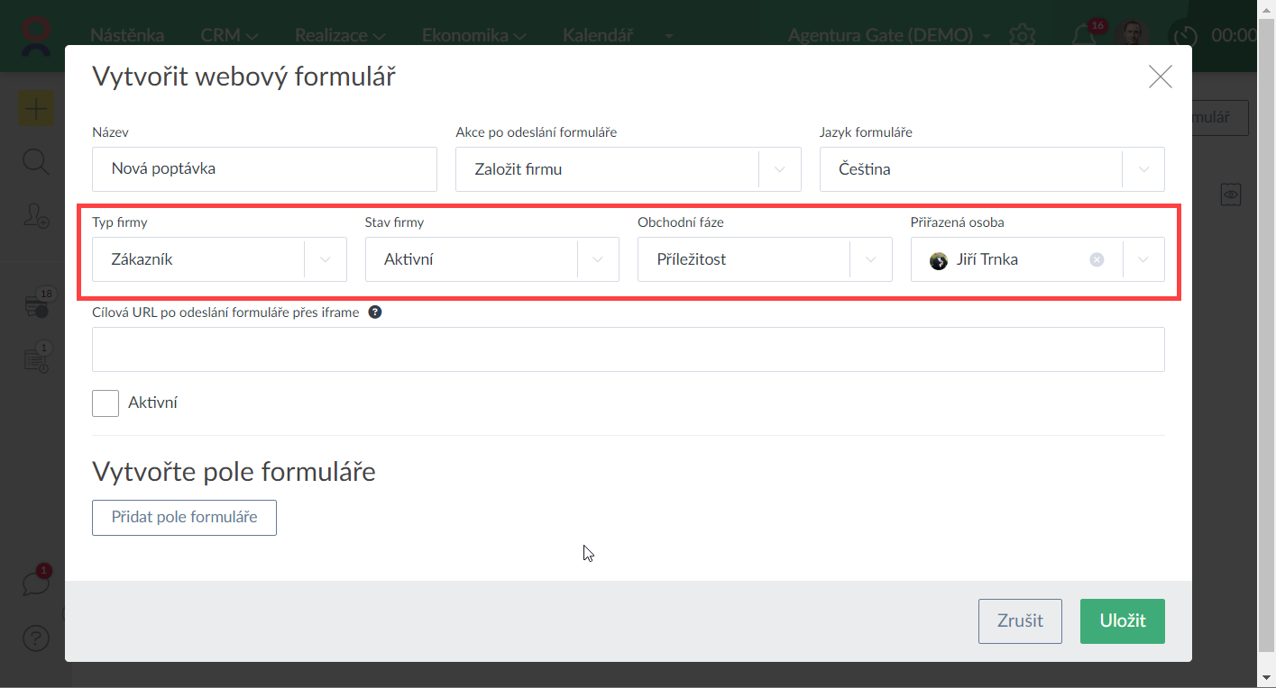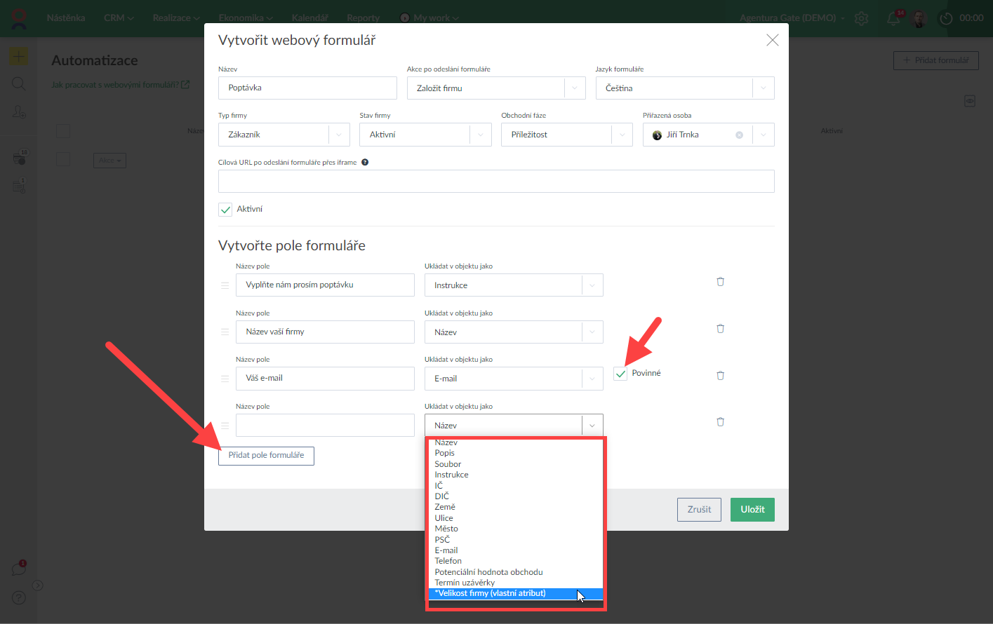 U každého pole tedy volíte, jako co se má zadaná informace ve formuláři uložit, např. zda jde u e-mail u firmy, začátek či konec projektu, plánovaný rozpočet, lokalitu projeku či adresu firmy atd. U těchto polí můžete zvolit, zda má být pole povinné či ne.