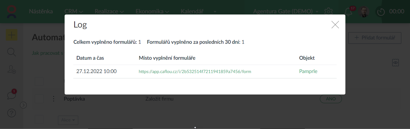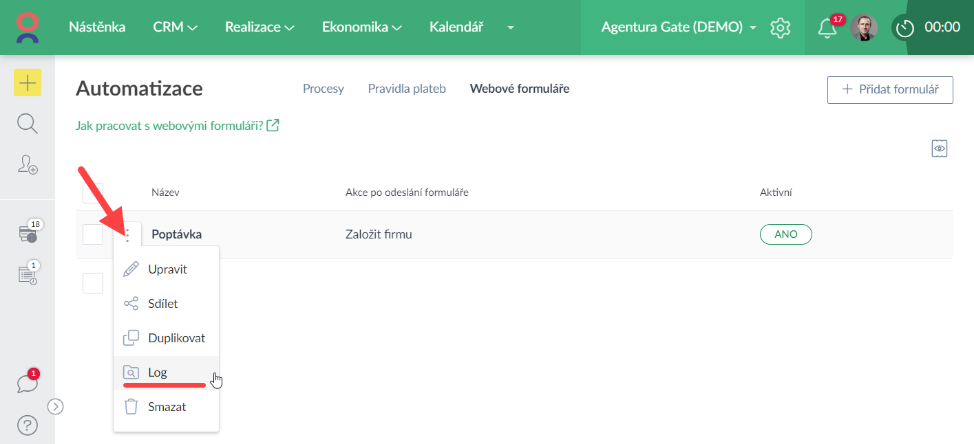 Z přehledu webových formulářů můžete také získat základní statistiky o počtu vyplněných formulářů a to přes "Log", který najdete v akčním menu formuláře.