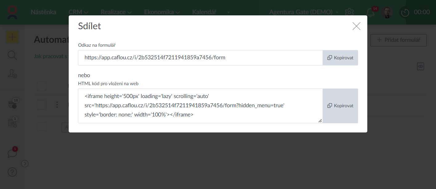 - Sdílet URL formuláře - zde sdílíte url, která formulář zobrazí na doméně Caflou (např. https://app.caflou.cz/i/2b532514f7211941859a7456/form)