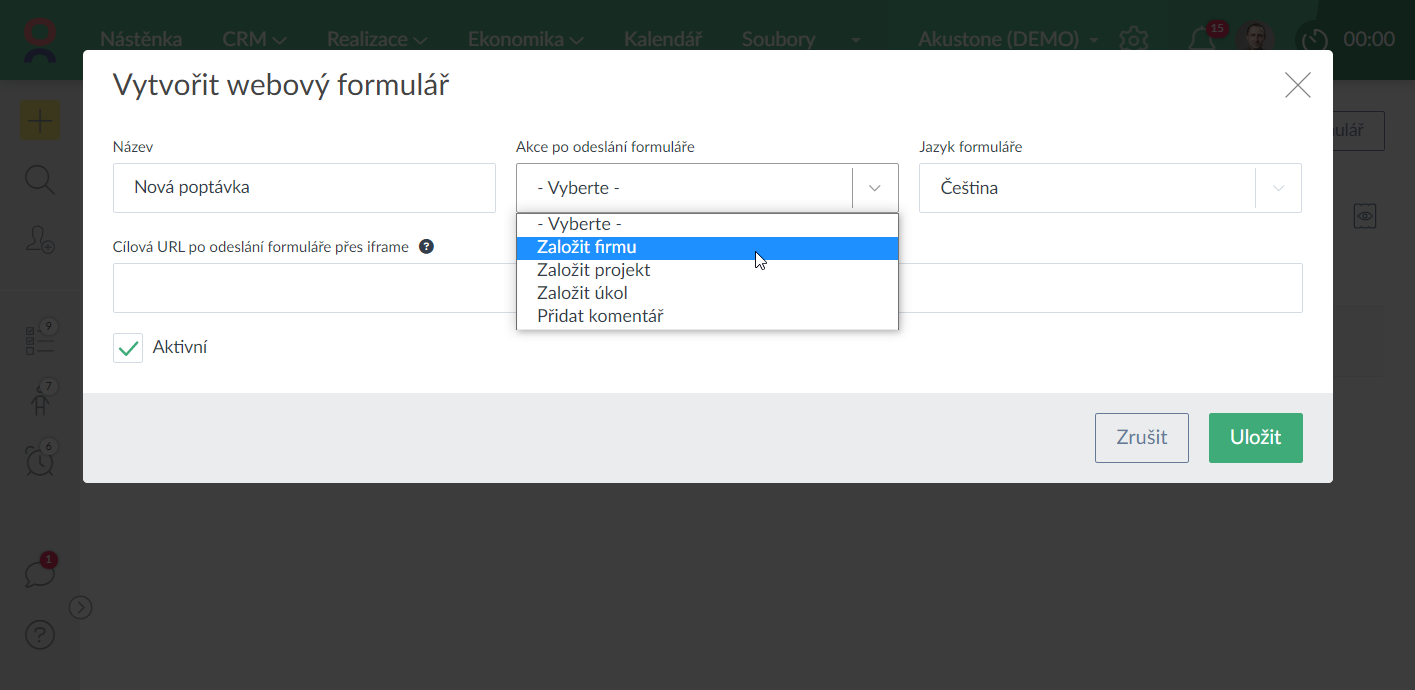 - Založit úkol (můžete určit, do jaké firmy a projektu se daný úkol zapíše)
