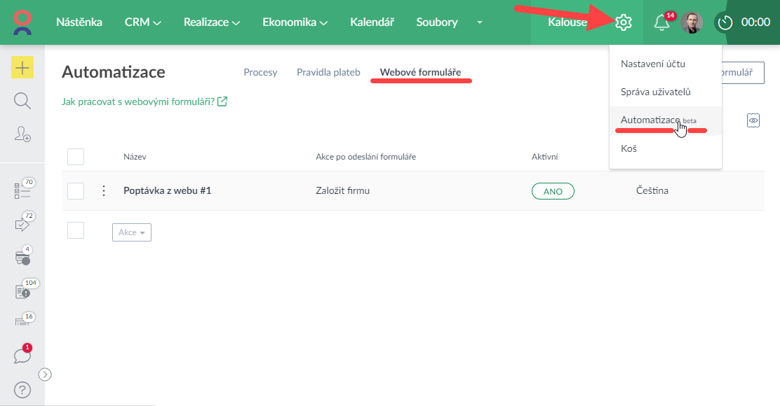 Vlastní formuláře na web vytvoříte v sekci "Automatizace" a "Webové formuláře".