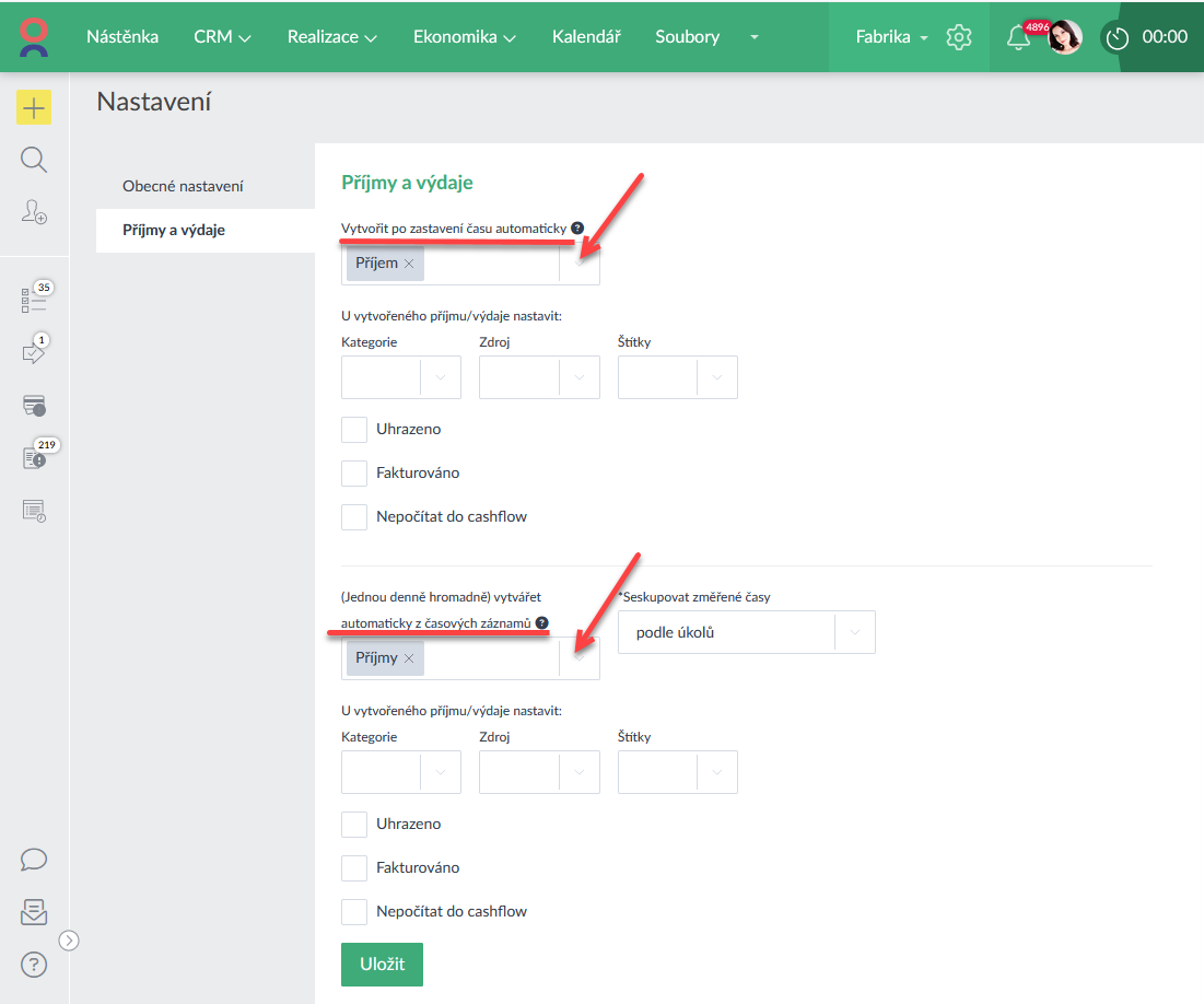 1/ Vytvořit po zastavení času automaticky: příjem nebo výdaj.