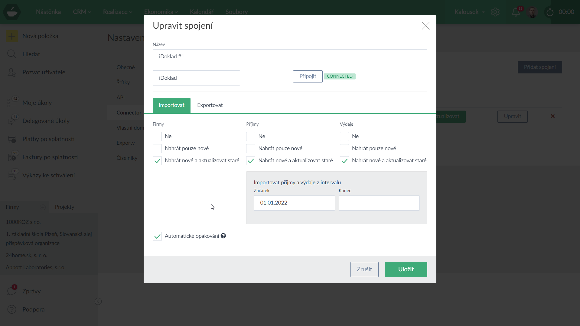 Do Caflou z iDokladu můžete importovat firmy a pak také faktury (jako příjmy a výdaje) pro účely řízení cash flow.