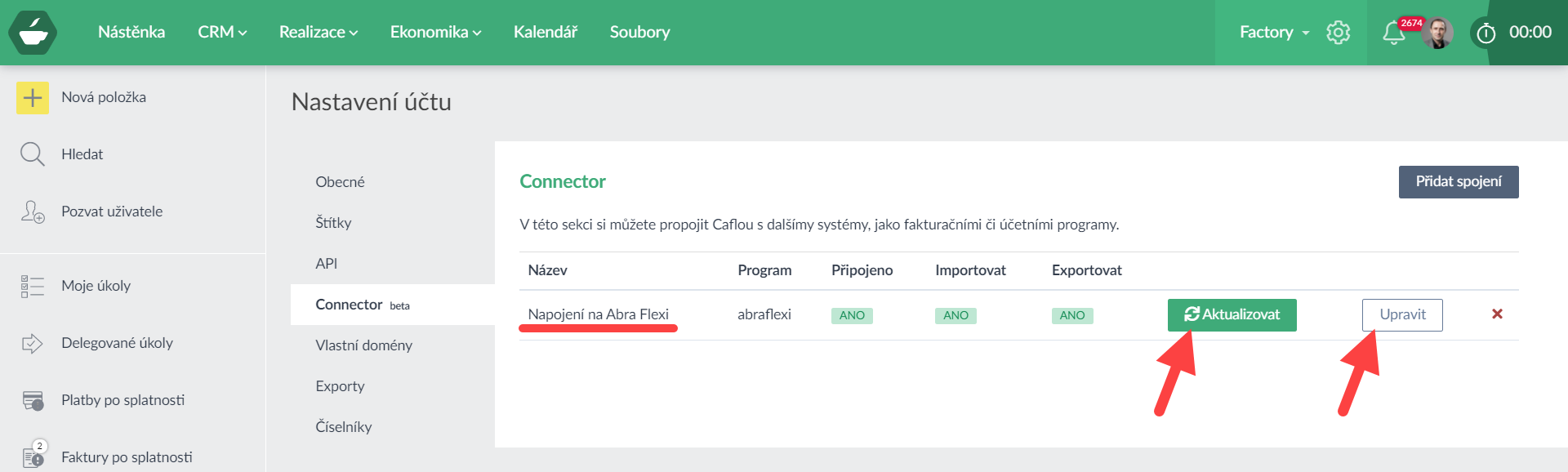 Jednou odeslané doklady a projekty z Caflou do Abra Flexi se už dalším exportem neaktualizují.