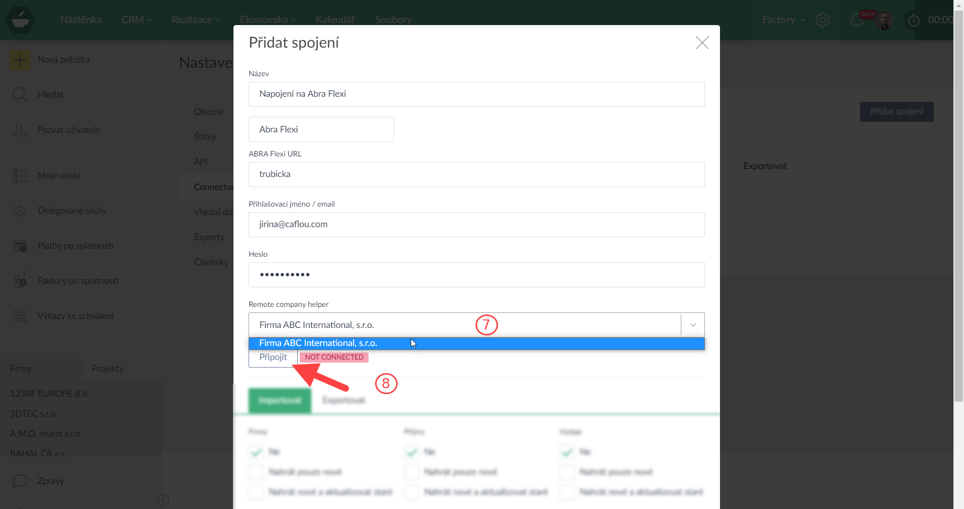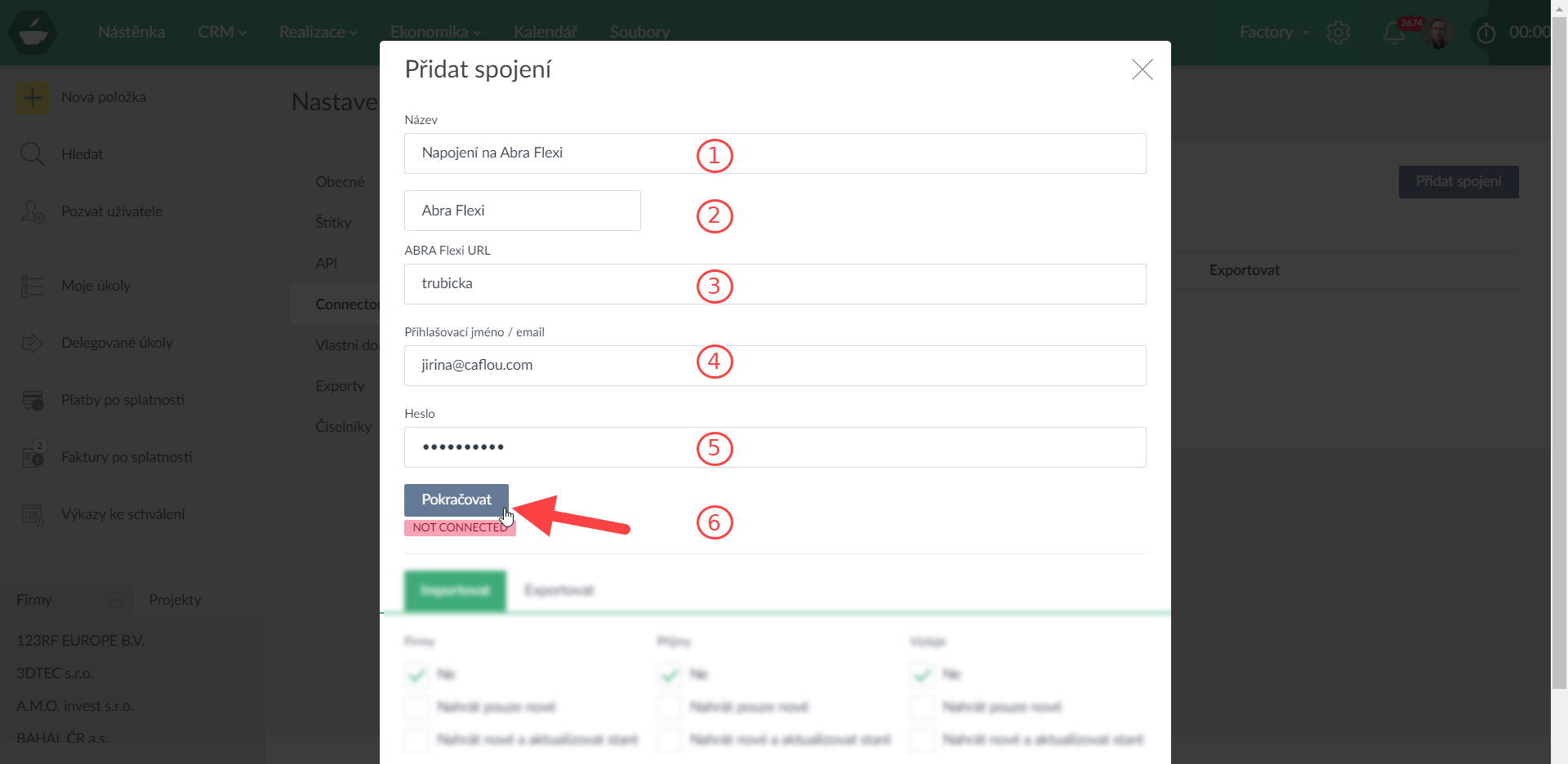Úspěšné propojení bude signalizováno stavem "connected". Poté je třeba nastavit, zda chcete data do caflou importovat nebo data z Caflou exportovat. Každý "směr" má svoji oddělenou záložku.