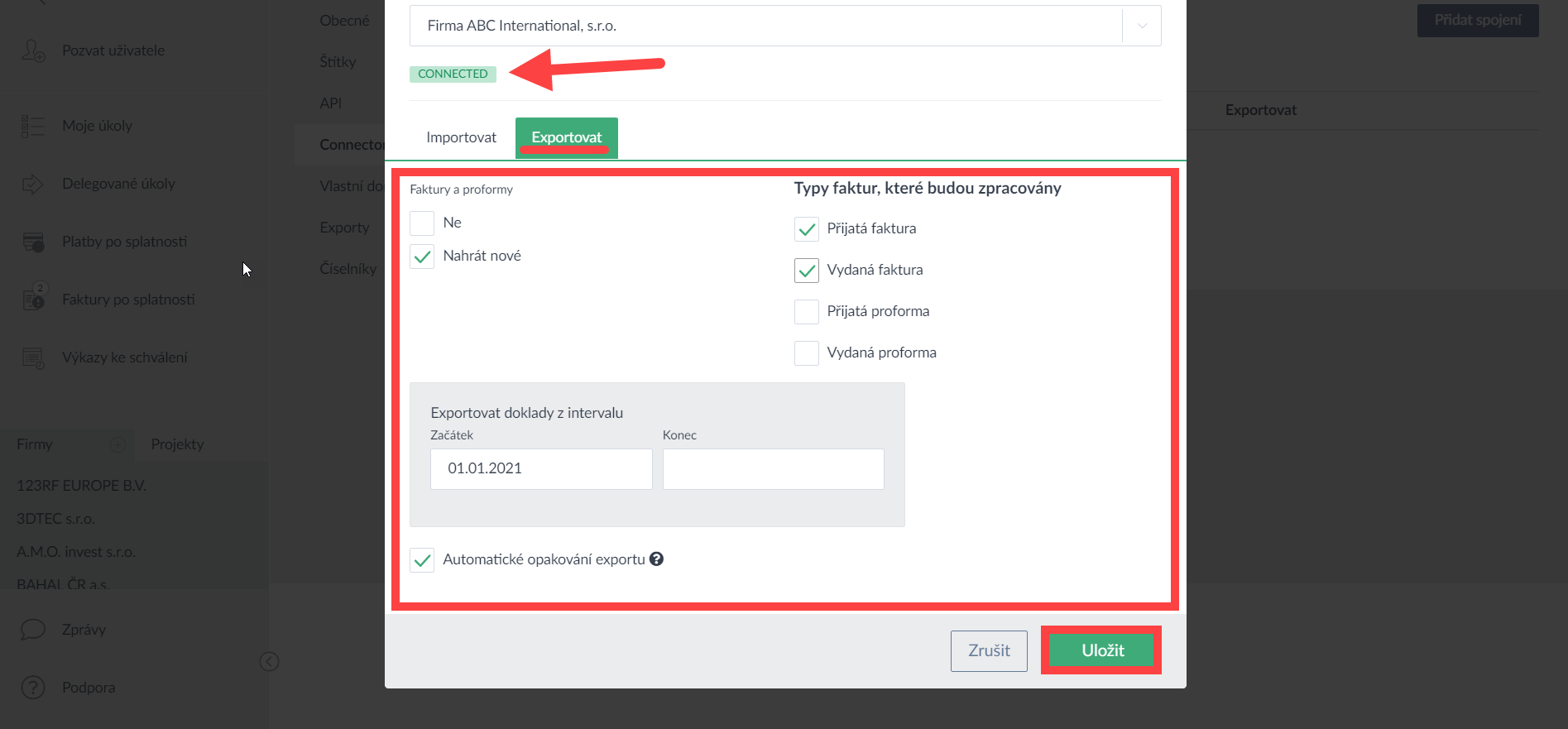 - Automatické opakování - pokud zaškrtnete, pak export probíhá automaticky a exportuje se alespoň 1x denně