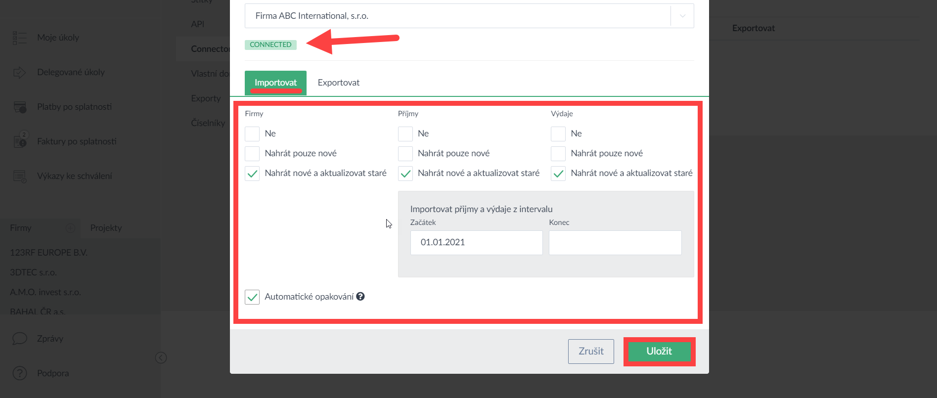 - Importovat příjmy a výdaje z intervalu - můžete zvolit, zda chcete importované příjmy a výdaje omezit intervalem (např. pouze příjmy a výdaje od 1.1.2021 apod.)