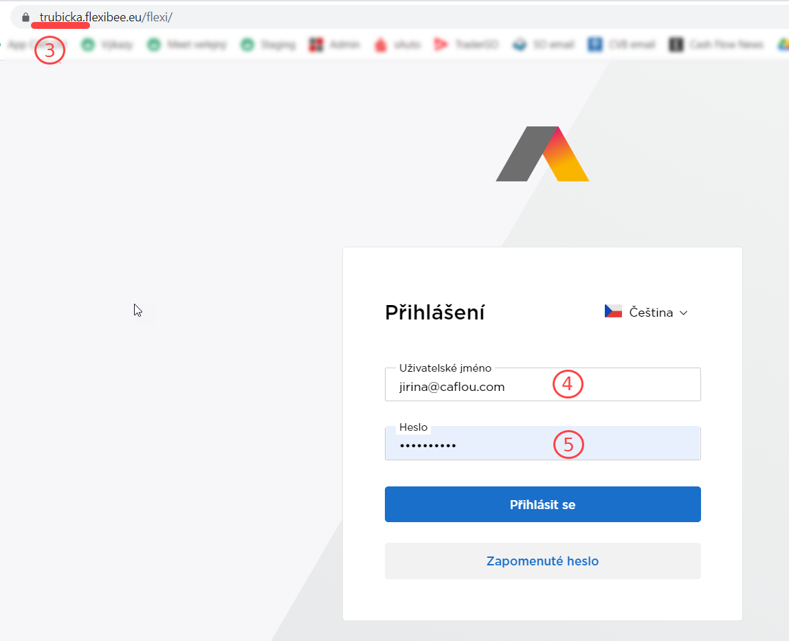- Vyplníte přihlašovací jméno nebo email, kterým se hlásíte do vašeho účtu Abra Flexi (viz další obrzek) (☝ použijte část před @)