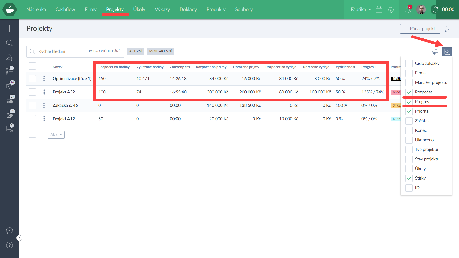 Stačí si v přehledu projektů zobrazit sloupce označené jako "Rozpočet":