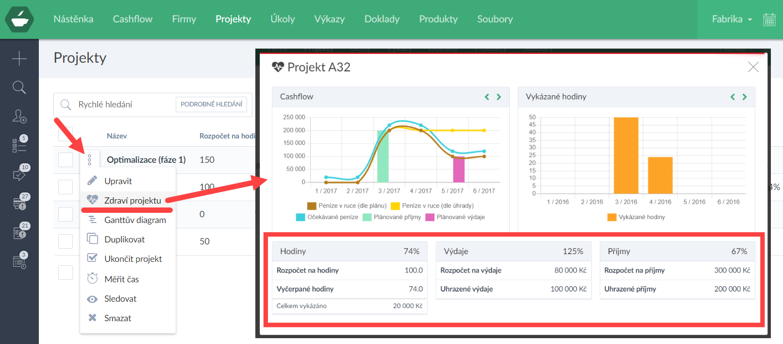 Na úrovni jednoho projektu si pak můžete také zobrazit "Zdraví projektu", kde také vidíte čerpání rozpočtů právě pro jeden daný projekt (hodiny, příjmy, výdaje):