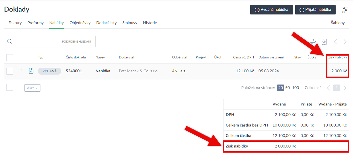 Zisk vidíte také v přehledu nabídek ve sloupci "Zisk nabídky" a pro vyfiltrované nabídky vidíte také sumárně zisk v přehledu nabídek: