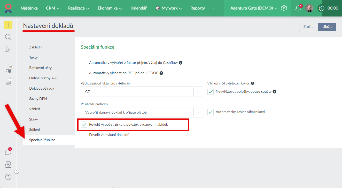 Přímo při vytváření nabídky si můžete zobrazit její ziskovost. Stačí si funkci povolit v Nastavení dokladů -> Speciální funkce: