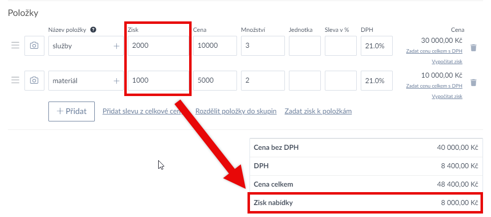 Zisk napříč položkami nabídky pak vidíte přímo ve formuláři nabídky: