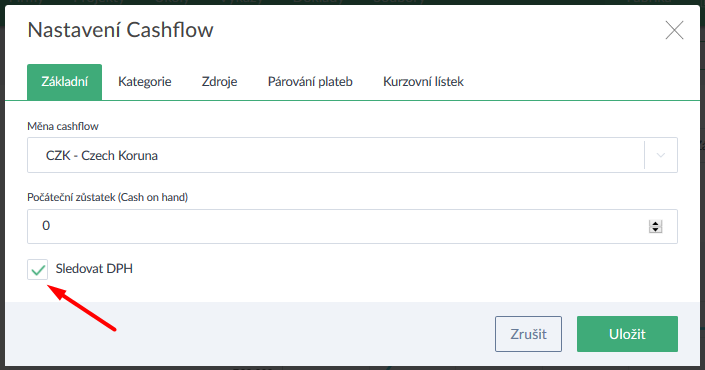 Pokud chcete v Cashflow sledovat DPH, jděte to nastavení Cashflow a zaškrtněte volbu "Sledovat DPH" a uložte: