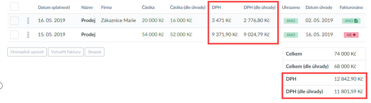 Jakmile začnete zadávat DPH u plateb, uvidíte indikativní součty DPH v přehledu Cashflow: