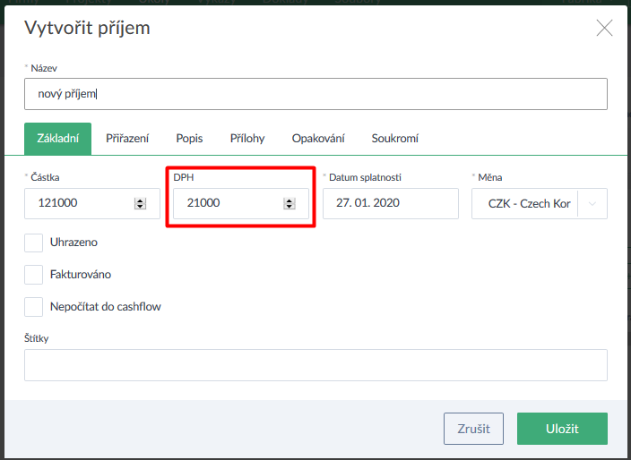 Jakmile změníte nastavení, u příjmů a výdajů bude možné evidovat výši DPH. Systém automaticky vypočítá výši DPH dle částky, použijeme výchozí sazbu DPH (dle nastavení fakturace/dokladů), hodnotu DPH lze ale vždy přepsat: