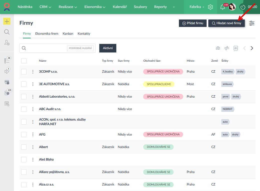 V sekci CRM - Firmy lze nově "Hledat nové firmy" dle potřebných parametrů: