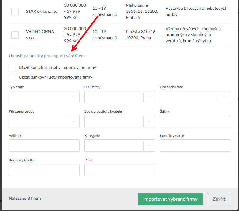 Před samotným importem si můžete upravit parametry pro import firem. Přiřaďte si k novým firmám typ (např. zákazník/dodavatel), stav (např. nespolupracujeme), obchodní fáze, přiřazená osoba, spolupracující uživatelé atd.