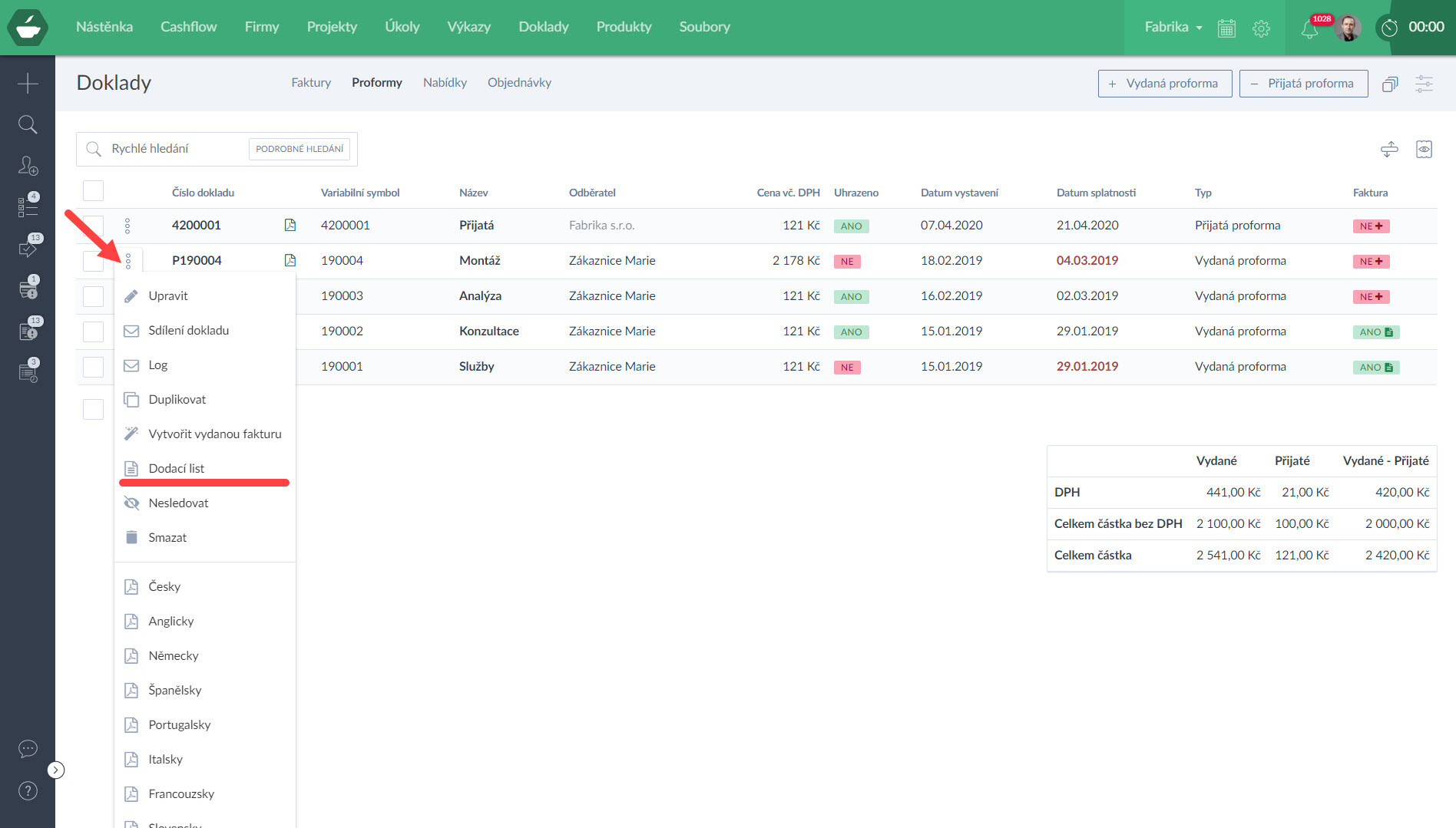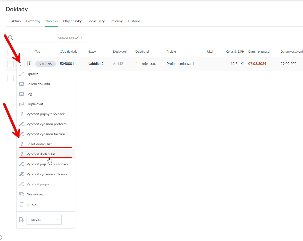 Dodací list vygenerujete přes akční menu dokladu. Máte 2 možnosti: