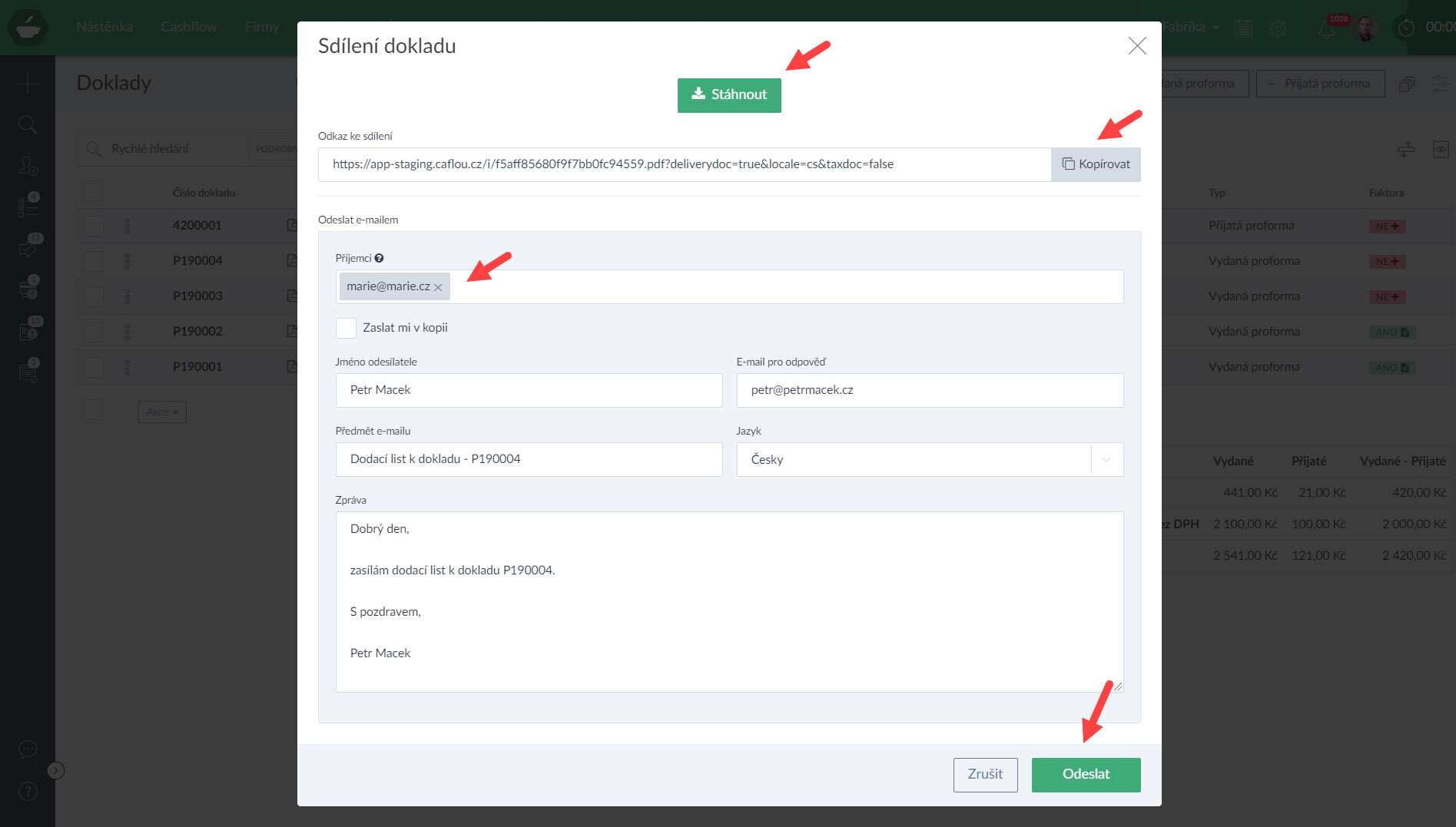 Následně můžete dodací list poslat emailem, případně si zkopírovat odkaz na doklad a nebo si doklad stáhnout: