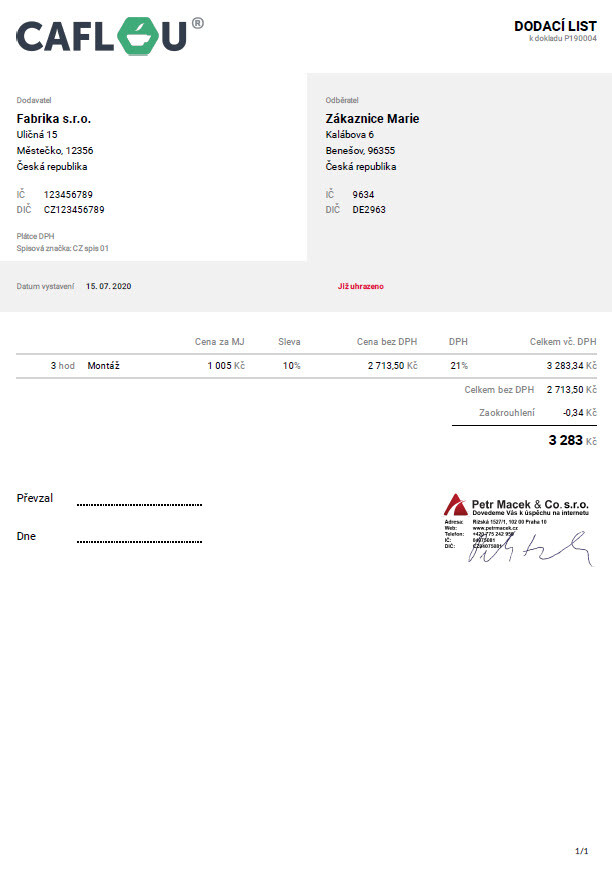 - Sdílet dodací list - z originálního dokladu jen vytvoříte "potvrzení", které přímo z Caflou sdílíte nebo můžete stáhnout ve formě PDF, takový dodací list se do Caflou neukládá