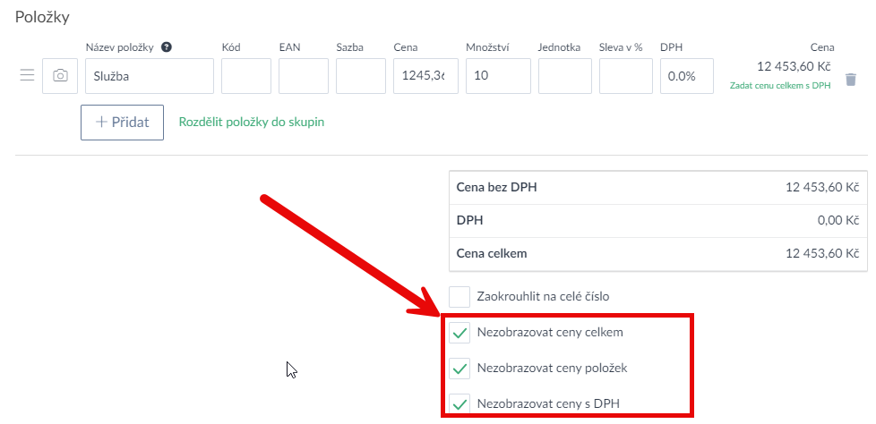 Dodací list lze také vytvořit/exportovat/sdílet bez cen (stačí zvolit ve formuláři):