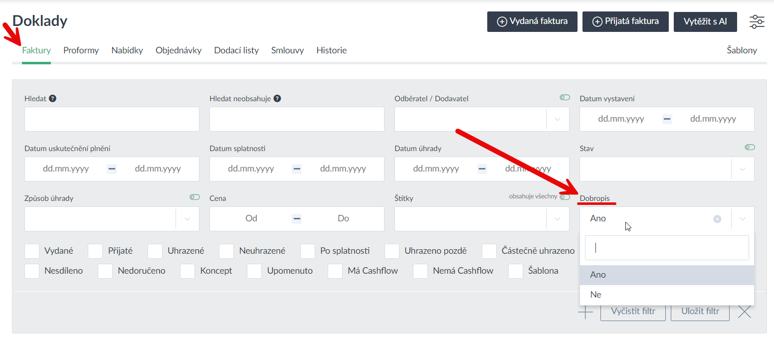 Veškeré dobropisy snadno najdete v přehledu faktur s využitím filtru na dobropisy: