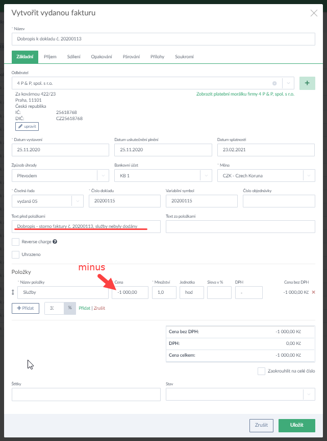 - do textu před položky uveďte, že se jedná o opravný daňový doklad/dobropis/storno, důvod, číslo původní faktury