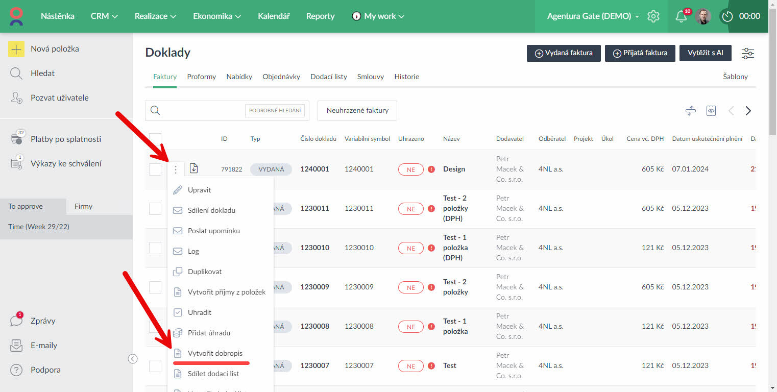Dobropis v Caflou z vydané i přijaté faktury vystavíte přes akční menu faktury, ze které dobropis vytváříte: